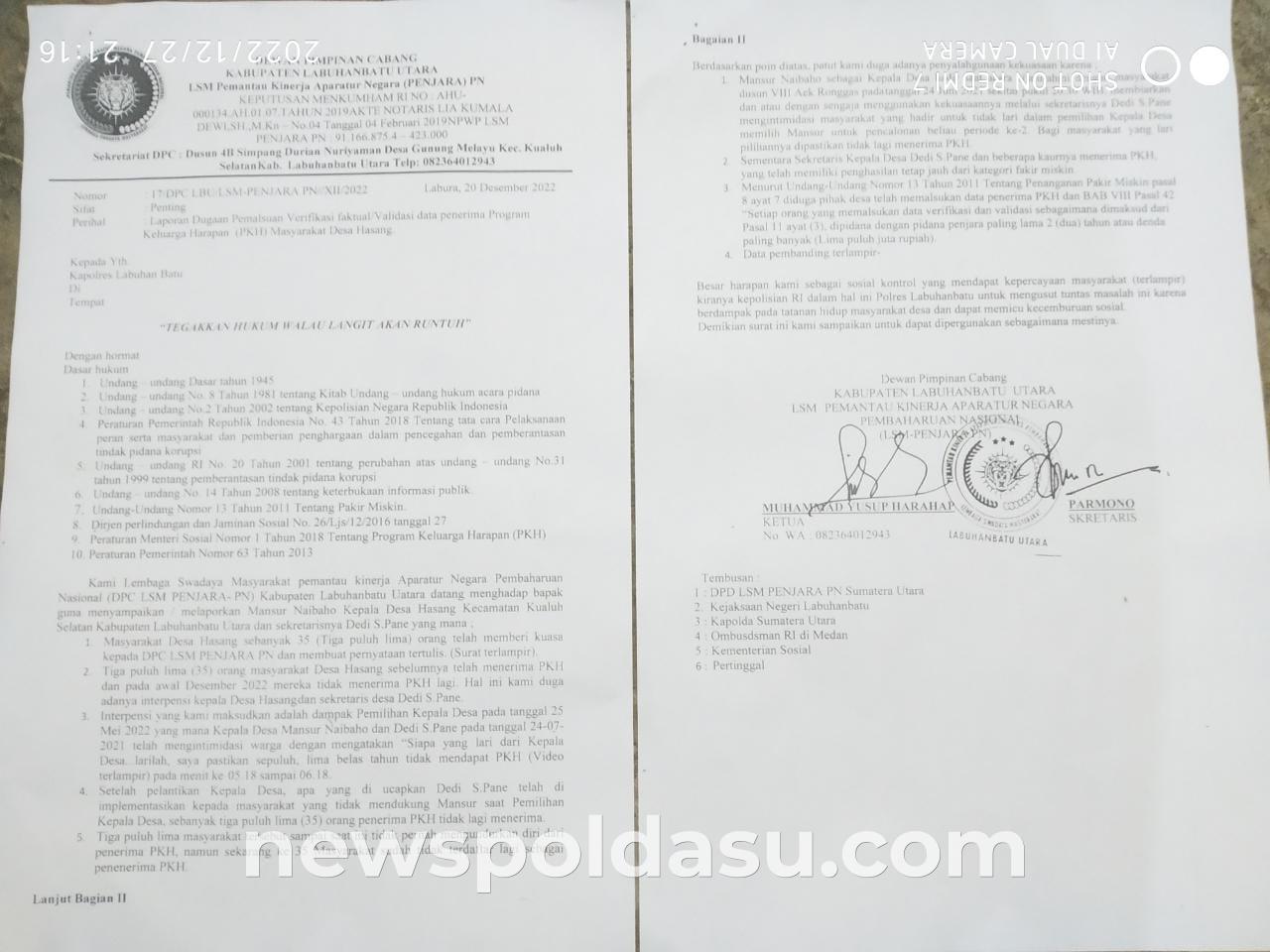 Labura: nespoldasu.com-35 Kepala keluarga warga Desa Hasang Kecamatan Kualuh Selatan Kabupaten Labuhanbatu Utara melalui Lembaga Swadaya Masyarakat (LSM) Pemantau Kinerja Aparatur Negara Pembaharuan Nasional (PENJARA PN) Dewan Pimpinan Cabang Kabupaten Labuhanbatu Utara, laporkan kepala desa Hasang Mansur dan sekertarisnya Dedi S Pane ke Aparat Penegak Hukum Polres Labuhan Batu secara Dumas (Laporan secara bersurat). Dengan nomor Surat: 17/DPC LBU/LSM-PENJARA PN/XII/2022 dugaan pemalsuan Verifikasi Faktual/Validasi data penerima Program Keluarga Harapan (PKH) Masyarakat Desa Hasang dari tidak mampu menjadi mampu, Selasa (20/12/2022).