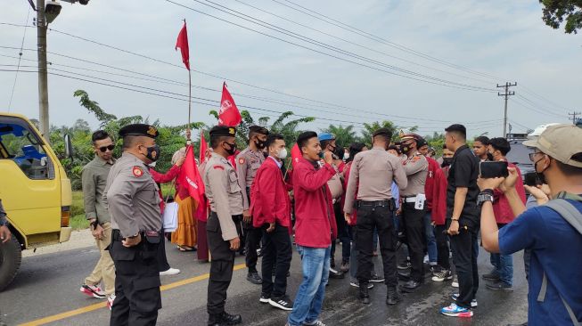 Mahasiswa berorasi menyampaikan aspirasinya di luar pagar kantor DPRD Asahan. Massa aksi tak dibolehkan masuk ke gedung DPRD.