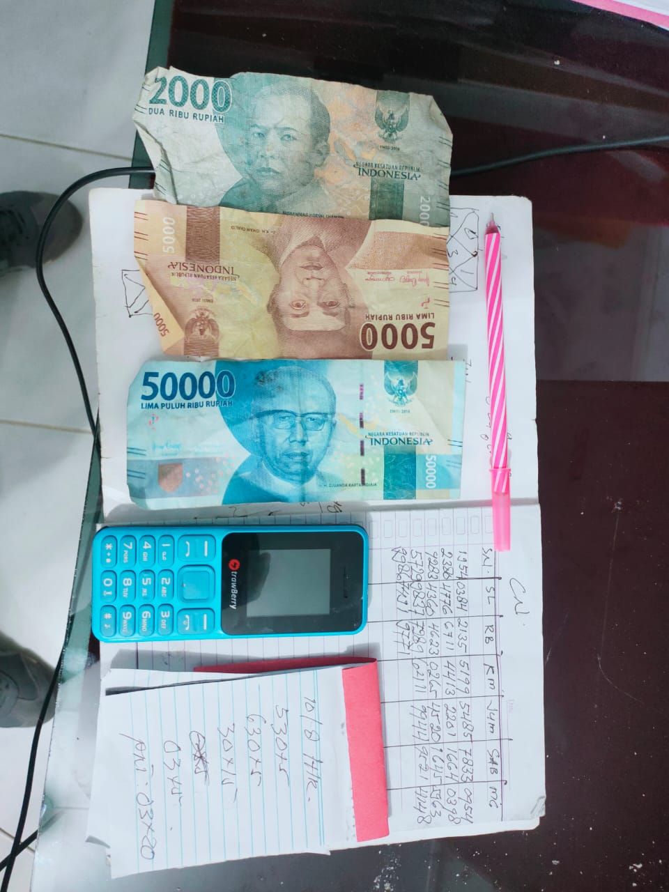 Kemudian dilakukan penggeledahan terhadap badan serta pakaian terlapor ditemukan barang bukti berupa 1 (satu) buah Handphone merk Strawberry warnah biru berisikan angka tebakan judi togel, 1 (satu) buah notes warnah merah berisikan angka tebakan judi togel, 1 (satu) buah buku tulis berisikan angka keluar pasangan togel, 1 (satu) buah kertas karbon, 1 (satu) buah pulpen warnah pink dan uang kertas sebesar Rp. 57.000,- (lima puluh tujuh ribu rupiah).
